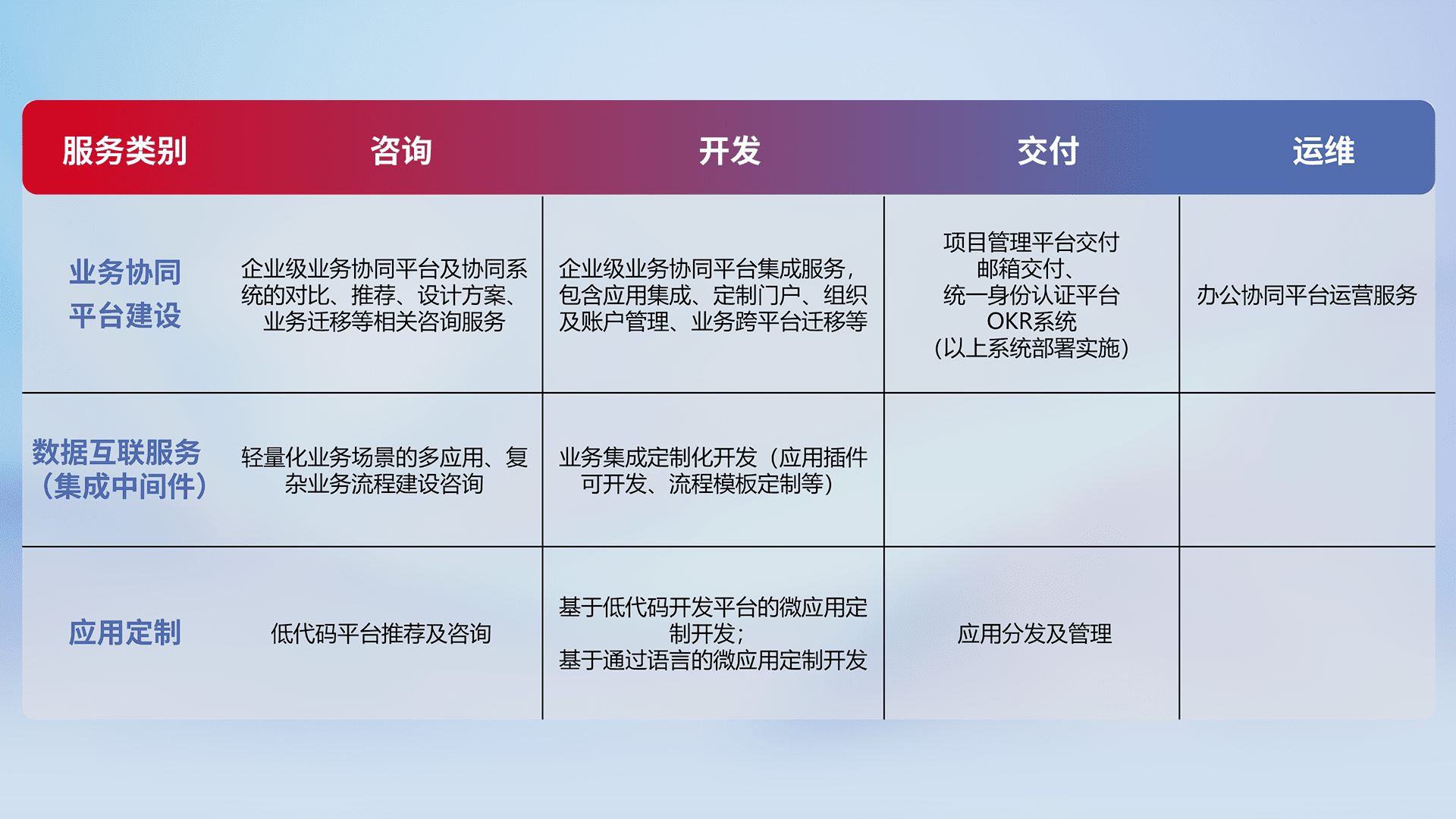 针对钉钉、、、、企微、、、、IDaas等平台级产品提供产品的规划、、方案、、交付、、、定制化开发等服务,,,实现如统一协同办公、、智能客户服务、、混合会议管理、、智能数据查询、、、等业务场景,,,,实现数字化转型。。。。
