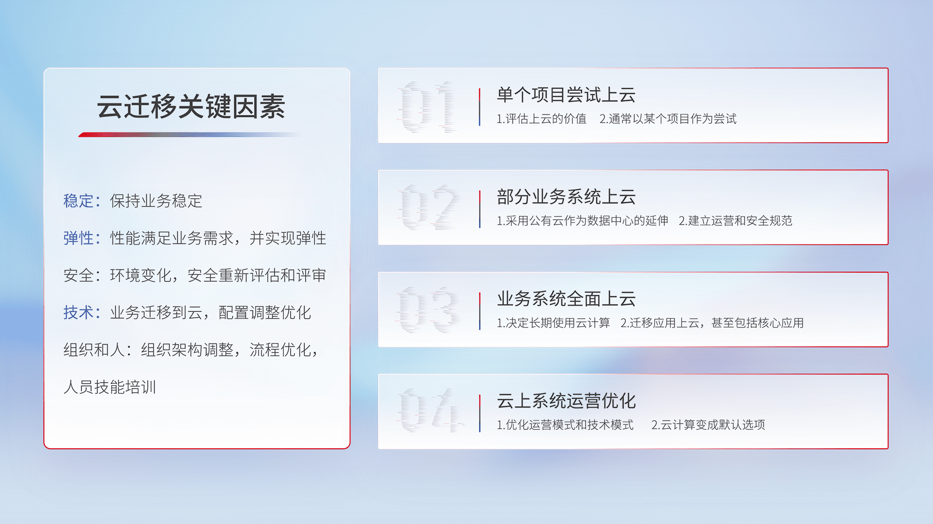 结合实际业务,,,,从规划设计、、、、云平台选型、、、云原生改造、、、、数据迁移、、、、集成交付,,迁移全过程为客户识别最佳上云路径,,,,做好风险识别管理,,,,设计网络架构、、身份权限、、安全审计合规、、、、操作审计、、日志审计、、、、监控告警策略、、、、多站点容灾设计等,,,对云上基础设施进行整体规划,,提升IT治理水平,,以满足弹性、、、、高可用、、高性能的需求。。