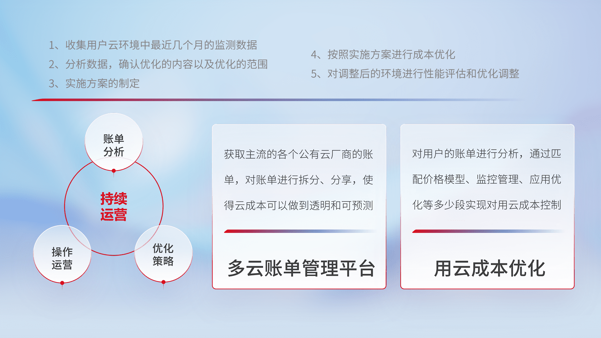 通过多云纳管,,,以统一的资源数据模型把客户的云资源进行抽象和封装,,,,进而实现对多云资源的统一操作,,保障云资源管理的可靠性、、稳定性与可用性。。。量身定制化运维内容,,配置、、、开发运维、、、补丁管理、、备份、、、、监控、、、认证和访问管理、、审计和日常巡检等,,,保障在用云过程中的可靠度,,,稳定度以及高可用率。。。。